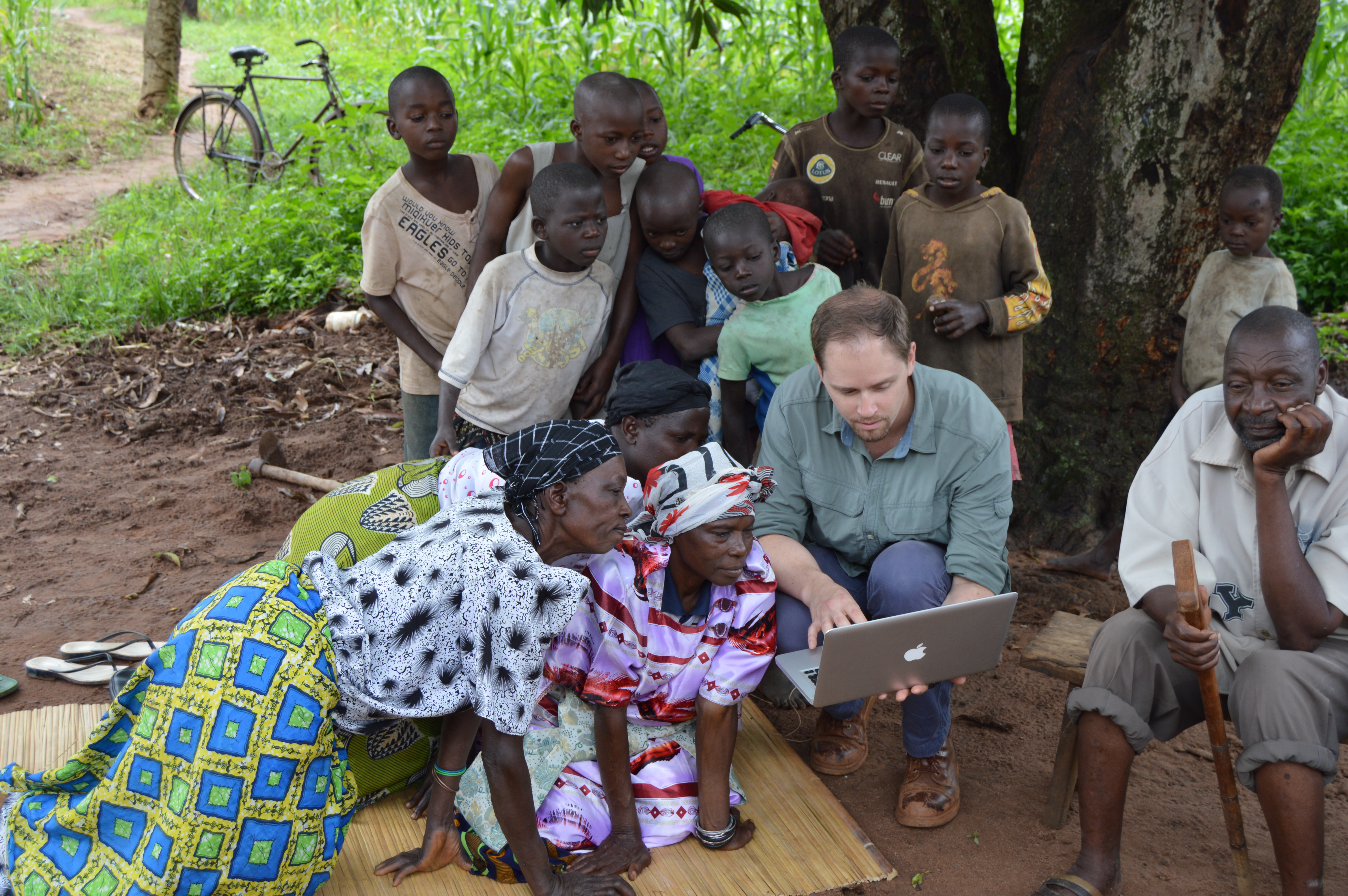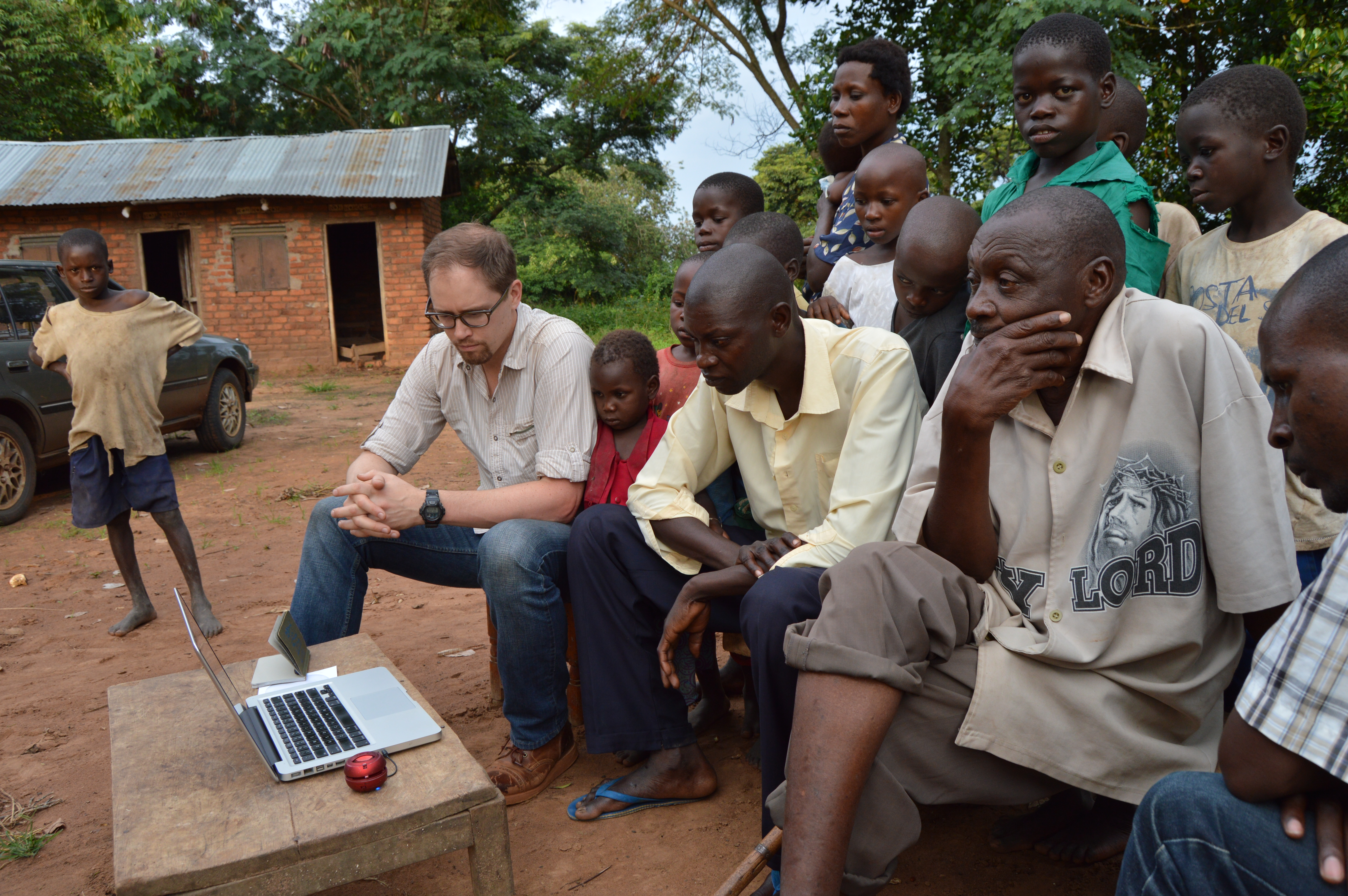 We began by showing Mzee Isiko and others the documentary in order to give them a better notion of what kinds of questions I’d like to ask. With a good deal of help from Mzee’s son, John Muyinda (below, middle, wearing a yellow shirt), we then made a list of the people who were both present at that funeral and still living in the area. We organized some transport for them, and agreed to meet them all the next morning.