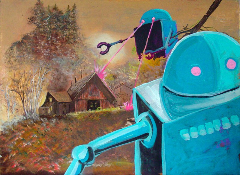 Wilson is artist-in-residence at a little local gallery that sits amidst artists’ studios, other galleries, and small, locally-owned shops. When he’s not painting monkey disciples of giant robots, he’s making disciples of the rest of us with his newest “corrected paintings.” About these, Wilson asserts that “occasonally, an artist will paint something, but neglect to include robots and/or monkeys. When I can, I fix that. The result? Side-splitting renderings of robots and monkeys, usually attacking the subject of someone else’s otherwise rather conservative painting: