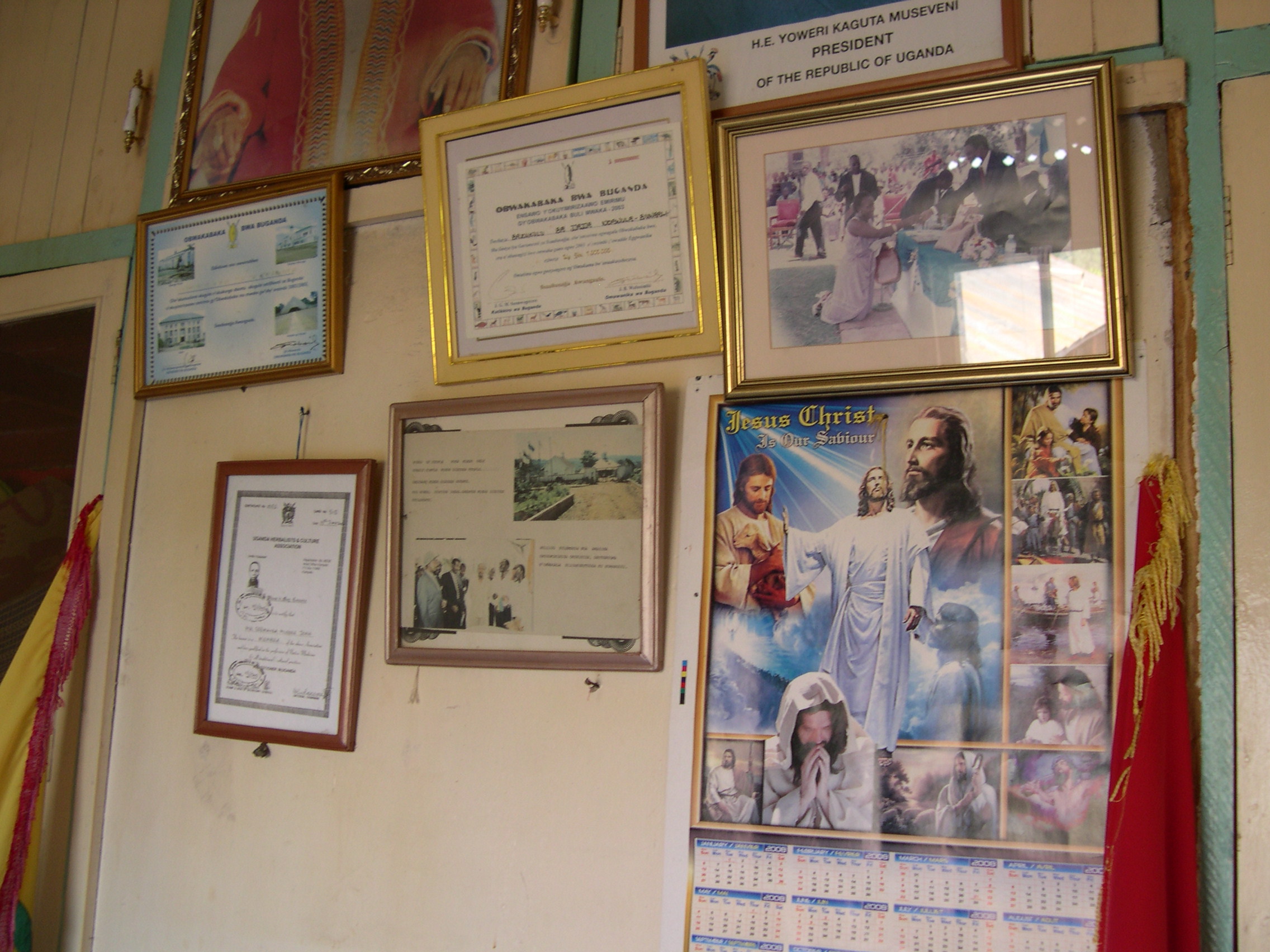 This rock might not look like much, but for members of the Ffumbe clan it’s a historically and ritually significant place. Hallowed places here are often covered by bark cloth or some other type of cloth. This one is covered with olugoye, a generic cloth that women use for a variety of purposes, including carrying babies (in which case it’s called engozi). It covers this rock, where the oral tradition holds that Ffumbe women used to give birth. The rock is discolored from afterbirth where Ffumbe ancestors began their lives.