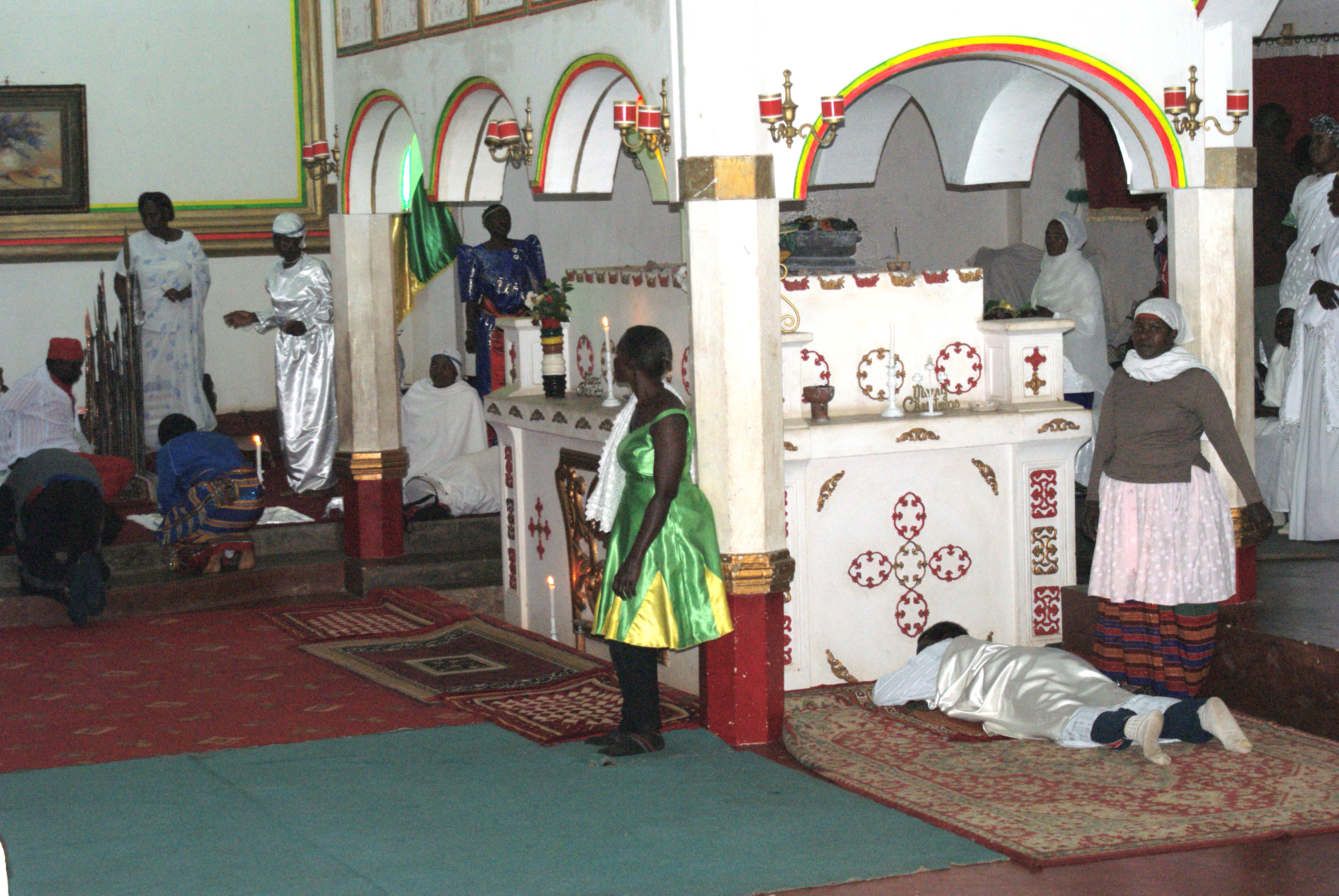 Curtains had been hung on the windows closer to the front of the space, and the group now had some chairs for people on the risers flanking the main nave. The shrine for Kiwanuka now had colorful trim, and the area at the front of the space had matching trim.